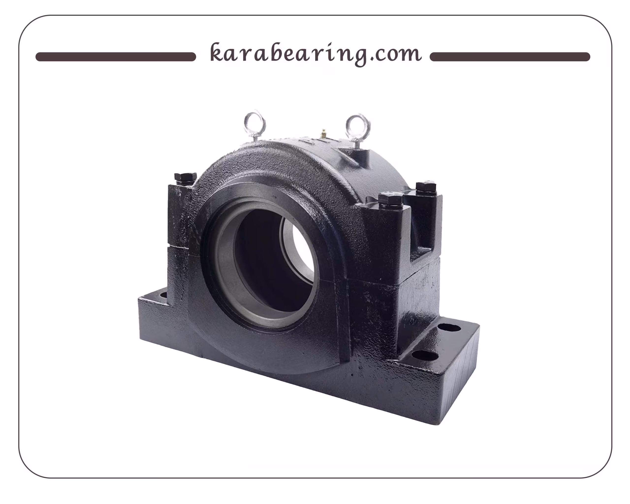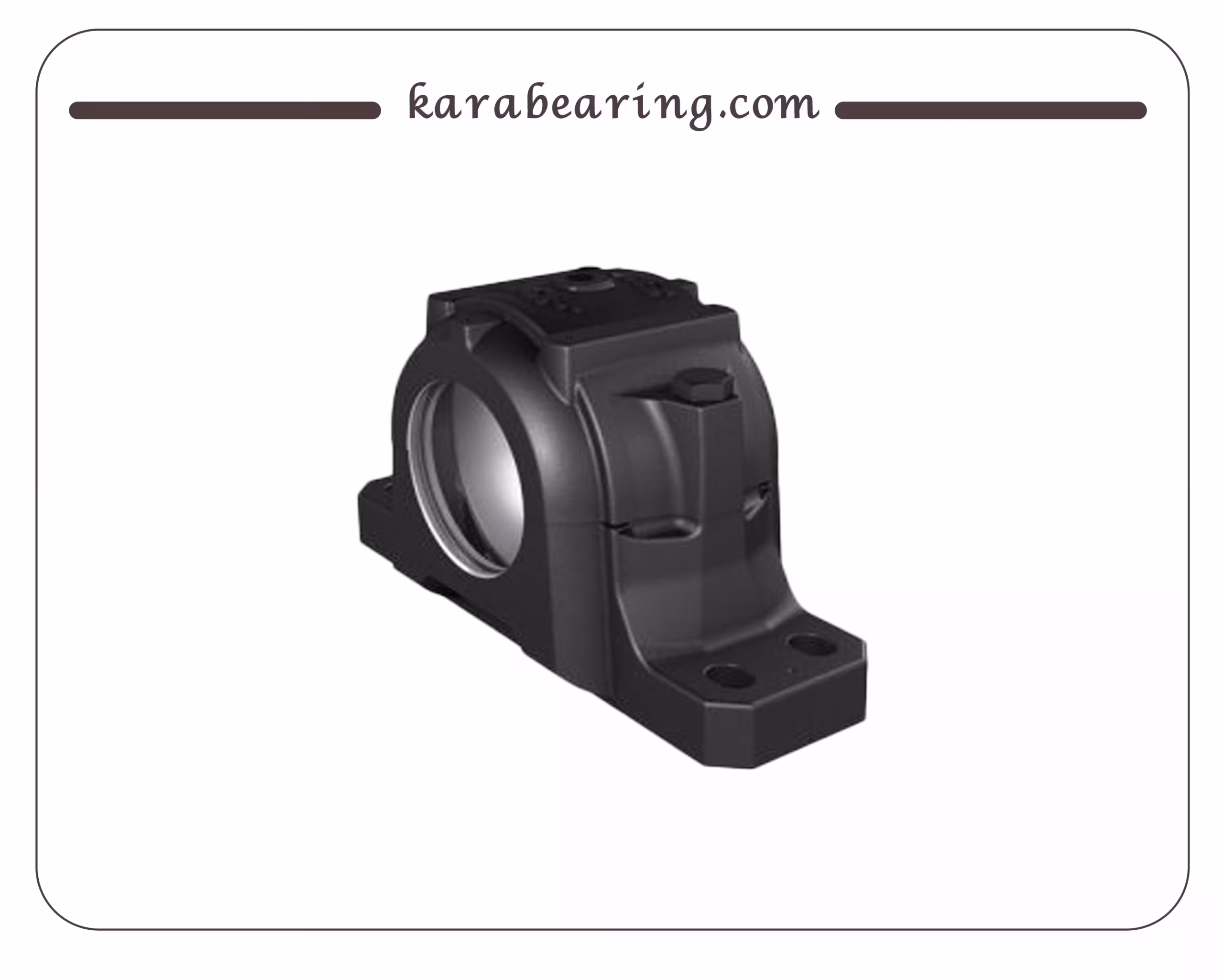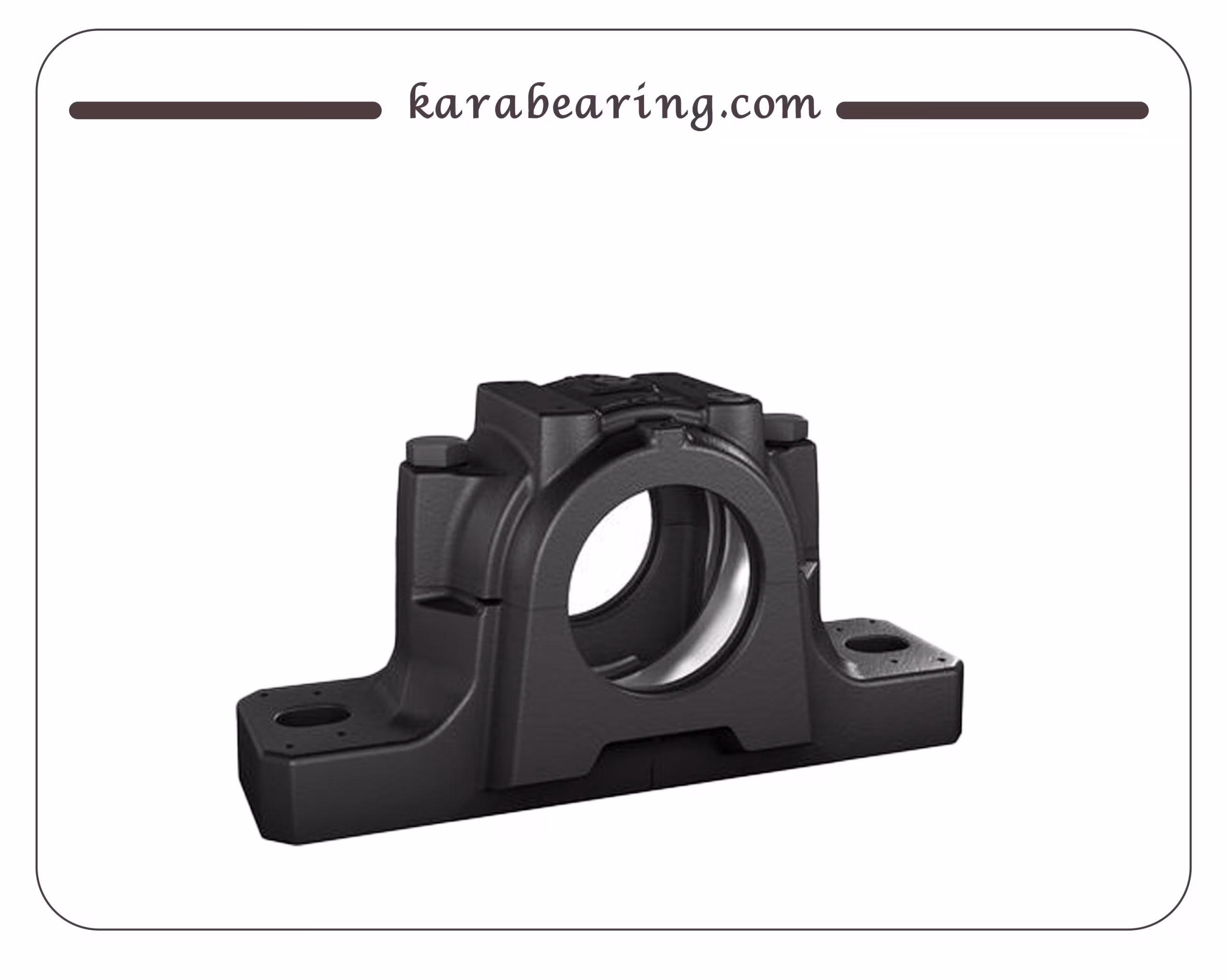 این هوزینگ از نوع اسپلیت (دو تکه) است که امکان نصب و جداسازی آسان را فراهم میکند. بدنه محکم آن معمولاً از چدن خاکستری ساخته شده و پایهای با چهار سوراخ برای پیچهای اتصال دارد. طراحی اسپلیت اجازه میدهد بدون نیاز به جابجایی شفتهای سنگین، یاتاقان را تعویض یا نگهداری کنید.